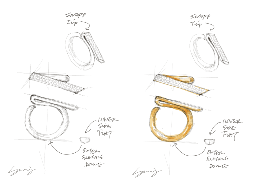 而挑戰是在於實現精湛技術與設計表達之間的平衡。每一個曲線,每一個金屬的摺疊,每一顆鑽石的擺放都是經過深思熟慮的。我們使用先進的技術,如鑽石測繪,來勾勒出自然形狀,創造出流暢、個性化且幾乎是定制的珠寶。這設計不僅僅是供人欣賞,而是要被體驗——觸摸、佩戴和融入生活。這就是我們建構的美學:既現代、精緻且人性化。