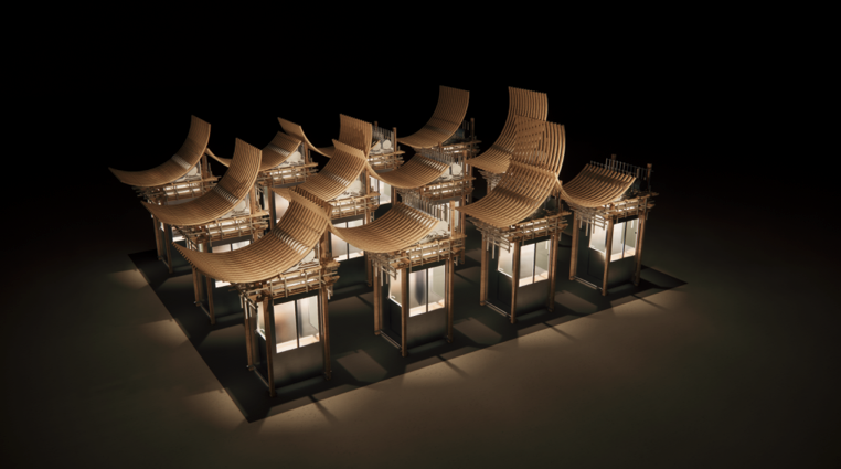 策劃人Chilai Howard表示:「展覽中的十二個展亭設計靈感源自香港標誌性的街頭攤檔『排檔』,其通道如城市街道般交錯延伸,充滿可能性。鋁材的運用呼應了1980至90年代香港街頭光亮的展示櫃,構成展亭的骨架。每個展亭皆具呼吸感:門窗可開可合,邀請觀眾以觸覺探索;上方的機械屋頂緩慢起伏,如海浪般律動,象徵連接兩洲的海洋與承載創意的船隻。 」