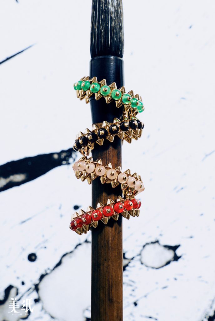 瑰麗金飾,在交錯相織的視覺底下,化作層次感十足的創意光芒。在Clash de Cartier系列中,有序的結構設計進一步拓展創意疆界,融入彩色寶石、縞瑪瑙等多種珍罕寶石,帶來豐富的視覺層次與色彩效果。染紅色或染綠色瑪瑙的純粹,與粉紅色玉石和縞瑪瑙互相輝映,更在閃亮的玫瑰金飾釘下交織排列,讓每一件戒指、項鍊和耳環成為不同造型裡的耀目光采。黃金手鐲與項鍊的幾何造型被大膽放大,突顯了Clash de Cartier系列的非凡氣勢與現代化美學。精湛工藝的呈現,意味每顆珠石經過嚴格挑選並精確排布,才能展現出和諧的色調和工藝。