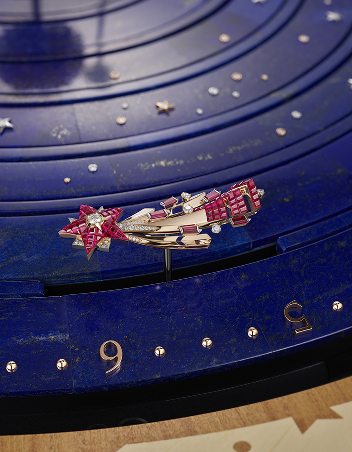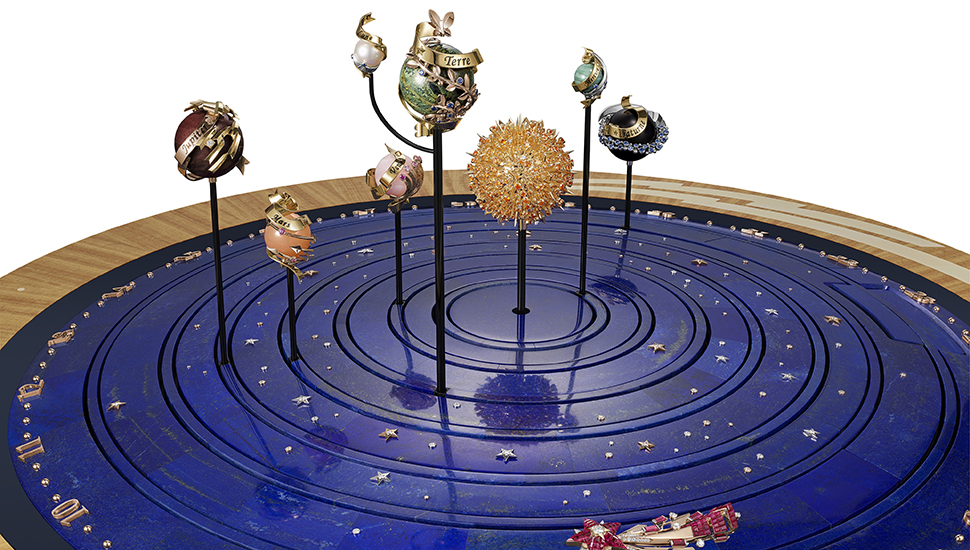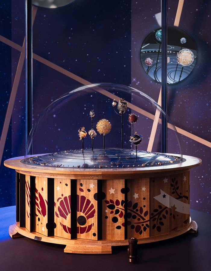 Planétarium自動機械裝置外型宏偉,尺寸為50 x 66.5 cm;將太陽及肉眼可觀察的太陽系行星活現眼前,包括水星、金星、地球及其衛星月球、火星、木星和土星。此臻品搭載一枚精密複雜的機械機芯,驅動每顆星體按其實際速度運行。於日復一日的韻律中賦予作品靈動生命力。作品裝嵌天象儀組件,以及由Van Cleef & Arpels研發的按需動態裝置,可自主啟動再現行星繞日的舞蹈。自動機械裝置放置於玻璃罩內,在琉璃帷幕下,一顆由玫瑰金、鑽石及Mystery Set隱密式鑲嵌紅寶石構成的流星自小門升起,環繞24小時表盤以優雅舞姿描繪時與分的流轉軌跡。流星掠過熒熒惑星,芭蕾舞曲亦隨之奏響。每一秒,星體或沿實際運行軌道相反的方向逆行,或跌宕起伏。