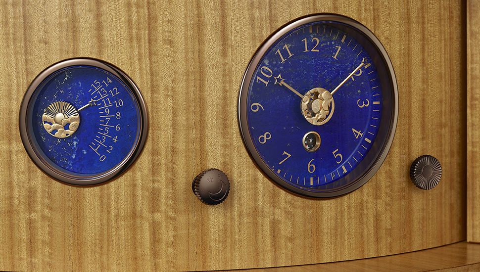 除了機械結構精密準繩,Planétarium自動機械裝置亦蘊藏鑑賞級的精湛工藝,值得細意品味。——新作以多種寶石及貴金材質組合鑲嵌,綴以神話符號,為星體賦予獨特意象。像是貝類對應金星,弓箭和雷電則分別指向火星和木星;金星以乳白粉紅水晶製成,地球則採用了玫瑰金、黃K金、藍寶石以及碧玉製作。每顆行星造型都極具心思,古典設計靈感源自18世紀星象圖的飾帶,行星上綴以神話符號,豐富詩意景象。當中尤以萬丈光芒的太陽最為矚目,它以超過500顆橙色石榴石以金針鑲嵌,配鑲黃色藍寶石和鑽石,加上動態裝置,稱它為世上最典雅華麗的「太陽射紋」並不為過。以檸檬木、白蠟木、破布木、紫心木製作的底座設有多個視窗,顯示時/分、晝/夜、年、月、日等萬年曆資訊及動力儲存,讓人窺探藏於這機械奇蹟中的15枚鐘琴。
