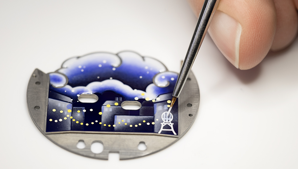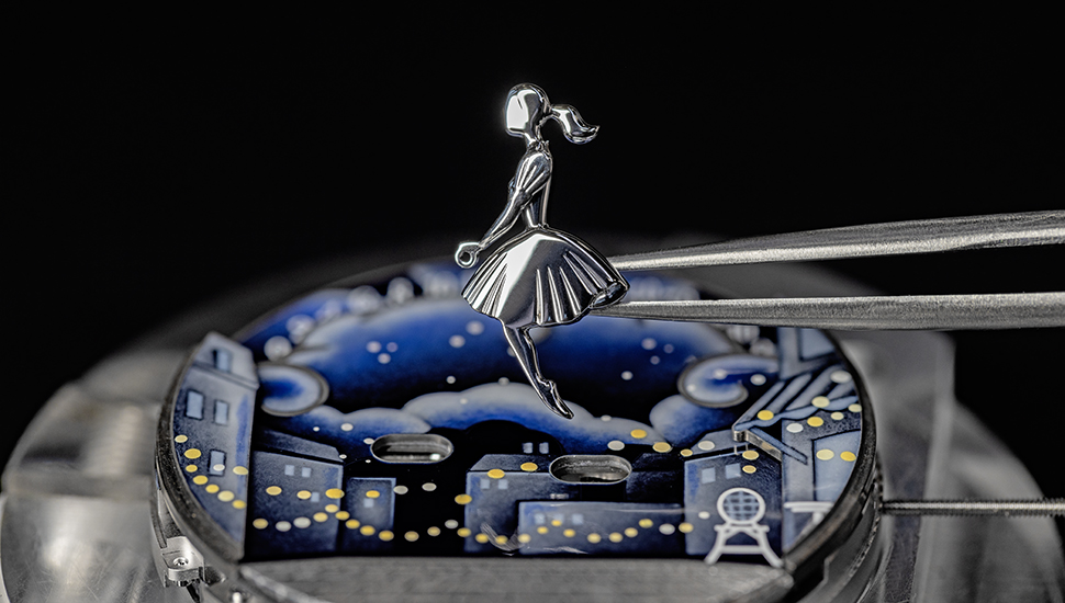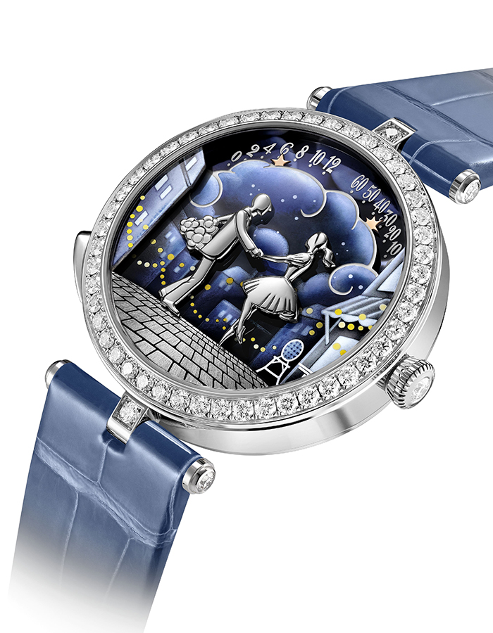 愛侶在中午及午夜上演戀愛劇場,向彼此靠近,以三點鉸接的手臂溫柔擁抱對方,姿態流暢自然。新作以重現浪漫巴黎接近為核心,為求呈現逼真細膩的層次效果,立體構圖的表盤設計不可或缺。延續戀人橋手法,表盤以五重灰階與墨彩琺瑯交替呈現,前者由工匠在深藍背景上填入白色「利摩日白釉」(blanc de Limoges),更見對比;後者則先以深淺藍色上釉,再以黃色釉彩和暖燈光,加強構圖層次之餘,配合白K金鋪砌的鵝卵石大街,光影效果也呼應夜幕下神秘星光。