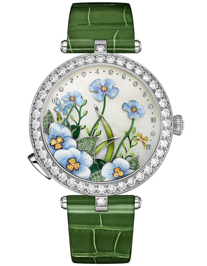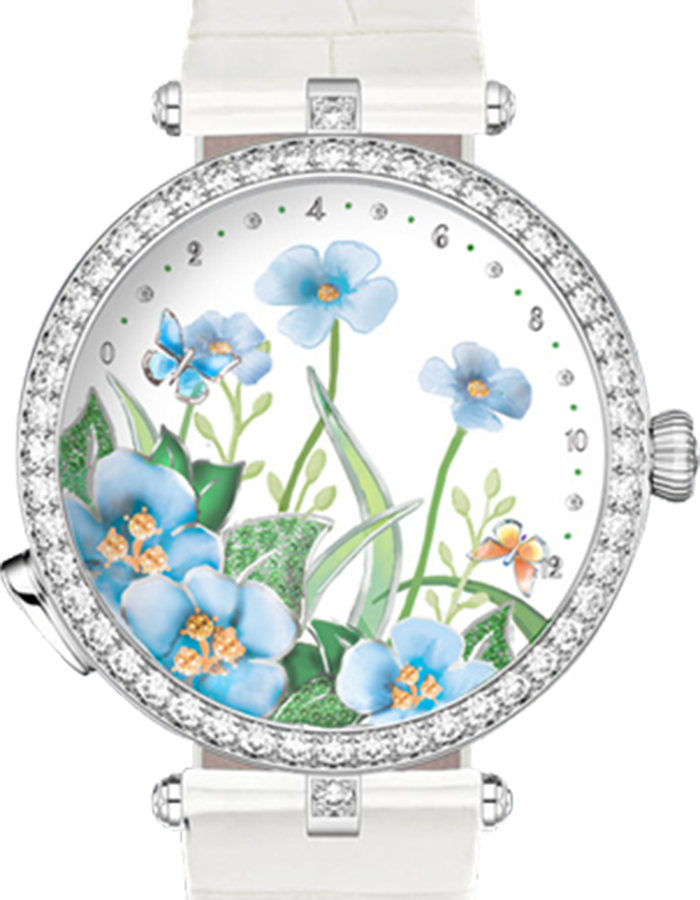 腕表採用38mm白金表殼,啞面珍珠母貝表盤鑲有鑽石、綠鈣鋁榴石、錳鋁榴石、虹光珍珠母貝等;天藍色丘陵琺瑯花瓣,在錳鋁榴石花蕊烘托下非常可人,綠葉經內填琺瑯也煥發生機,但野草更妙,還加上plique-a-jour彩繪玻璃琺瑯點綴。琺瑯工匠大師僅用一支貂毛筆畫龍點睛,Summer Breeze一下子便呈現漸層變化的色彩。按動7:30位置的按鈕,黃金和白金製成的兩隻蝴蝶將指引時間,以展示翩翩飛舞的美態輕拂花卉。時間隨著花蝶共舞景色悄然流轉。